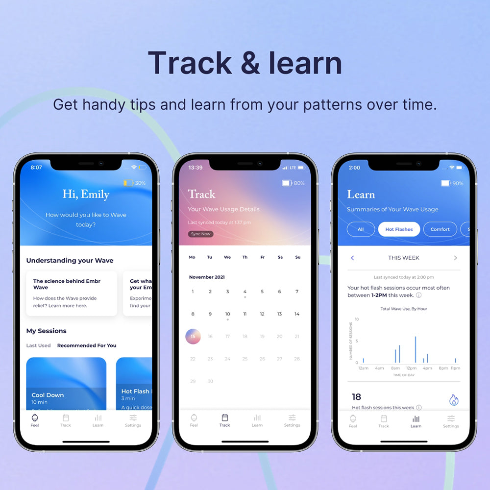 - Personalized relief — Connect to the Embr Wave 2 app to customize your relief. Explore 30+ customizable cooling or warming sessions in 6 categories: Personal Thermostat, Hot Flashes, Focus, Relax, Sleep, and Temperature Tools. Select duration options from 1 intense minute to 9 steady hours. Reprogram device buttons for fast access to your favorites. Track and optimize based on your unique patterns.